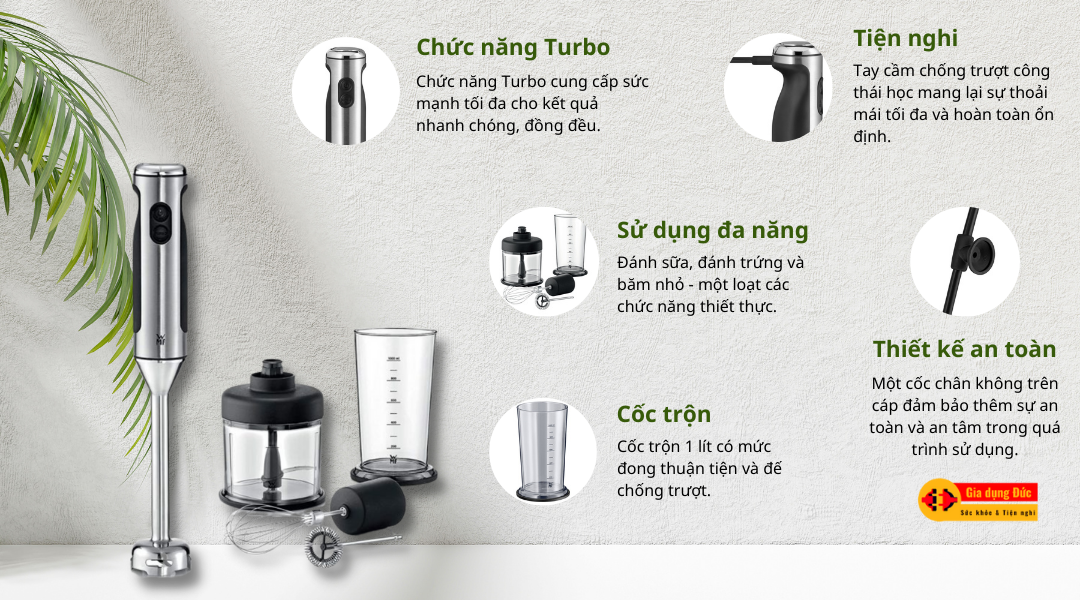Công nghệ dao WMF 2 + 2 cùng với động cơ 700 watt đảm bảo kết quả trộn hoàn hảo. Khả năng vận hành mạnh mẽ này dễ nhận thấy ở tốc độ cao 13.000 vòng / phút và tốc độ tối đa 125 km / h.